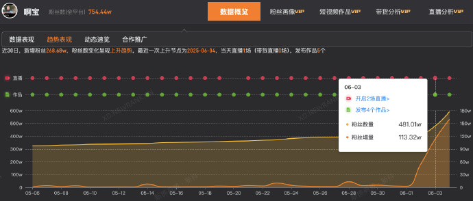 第三方数据显示,6月3日至4日,啊宝某短视频平台账号涨粉273.43万,每日涨粉均超100万。