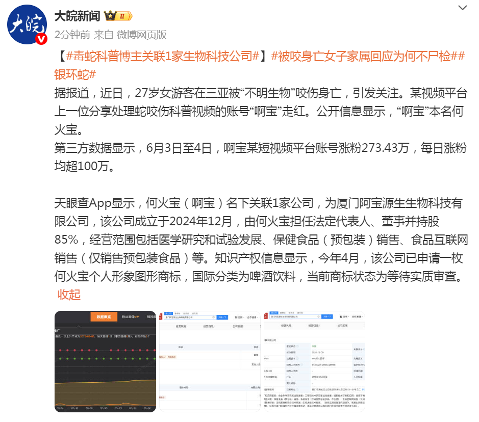 据报道,近日,27岁女游客在三亚被“不明生物”咬伤身亡,引发关注。某视频平台上一位分享处理蛇咬伤科普视频的账号“啊宝”走红。公开信息显示,“啊宝”本名何火宝。