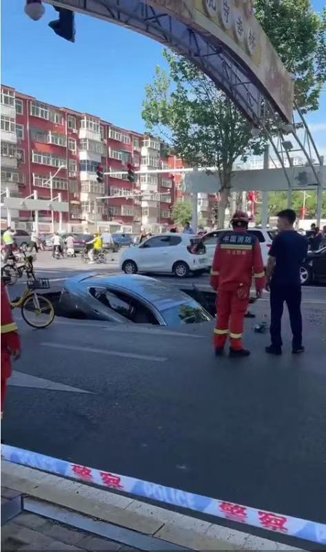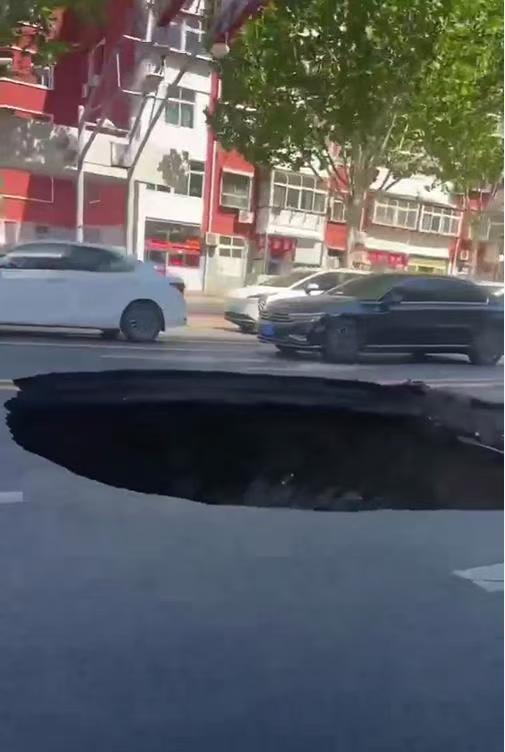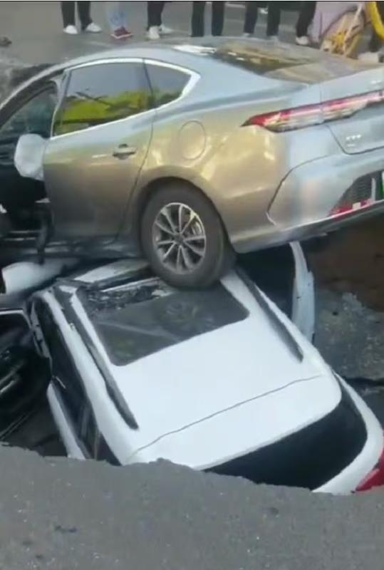 现场视频显示,柏油马路中央出现一个有几米直径的深坑,一辆冀D牌照的绿标灰车压在一辆白车车身上。有现场目击者称已经掉下去两辆车。