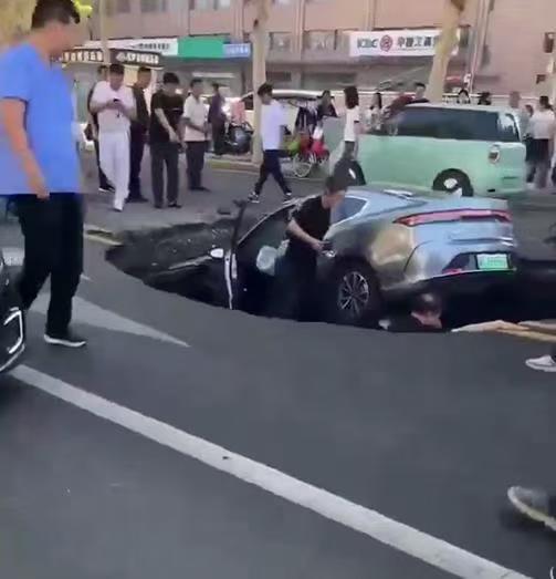 柏油马路突现深坑,有过往车辆猝不及防陷落