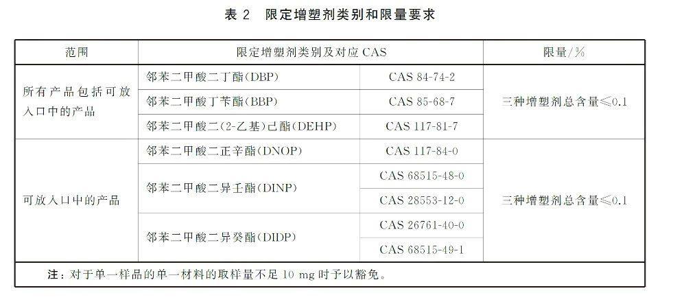 限用的增塑剂种类和限量来源:《《GB 6675.1-2014~GB 6675.4-2014〈玩具安全〉》