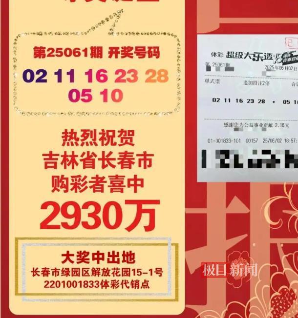 6月2日,超级大乐透第25061期开奖,前区开出号码02、11、16、23、28,其间,长春市民张先生(化姓)花费6元购买追加投注号码为05、10的2倍单式票,喜获29303390元的奖金。6月5日,极目新闻记者探访彩票获奖点长春市绿园区解放花园体彩点,了解张先生获奖的故事。