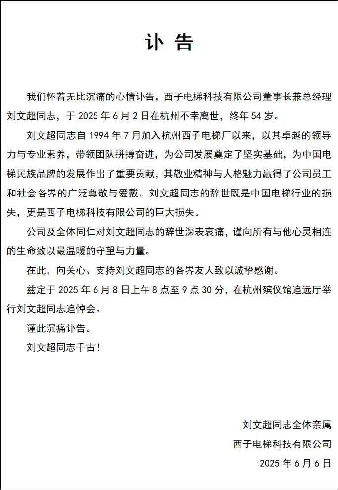 有消息称西子电梯科技有限公司总裁刘文超6月2日坠楼身亡,终年54岁。 6月5日,澎湃新闻从知情人士处获悉,西子电梯科技有限公司拟发布讣告。另据红星新闻报道,目前警方已排除刑事案件。