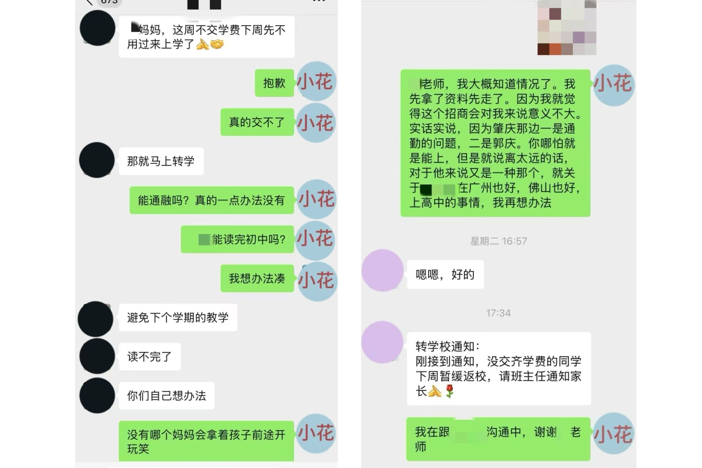 学校向小花催收孩子学费(微信截图由受访者提供)