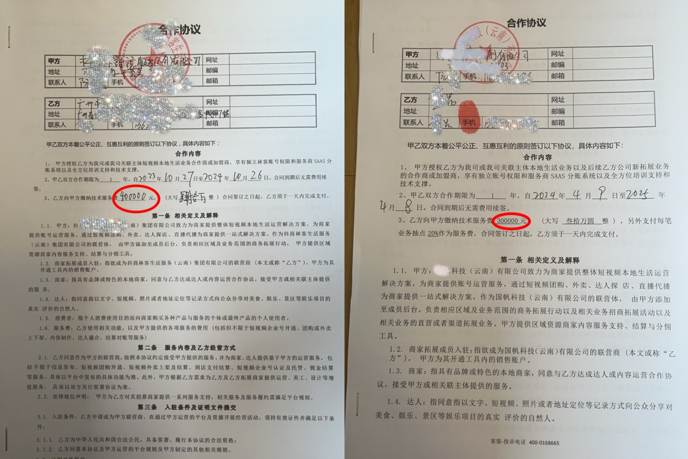 于是,在2024年4月7日,小花又和他们签了第二份合作协议,支付合同价款30万元,作为该公司关联主体“本地生活”的合作商或加盟商,“享有独立账号权限和服务商SAAS分账系统以及全方位培训支持和技术支撑”。这份合同的甲方盖着“XX科技(云南)有限公司合同专用章”。