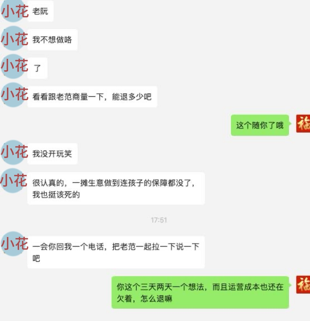 小花捉襟见肘,阮催促欠款(截图由受访者提供)