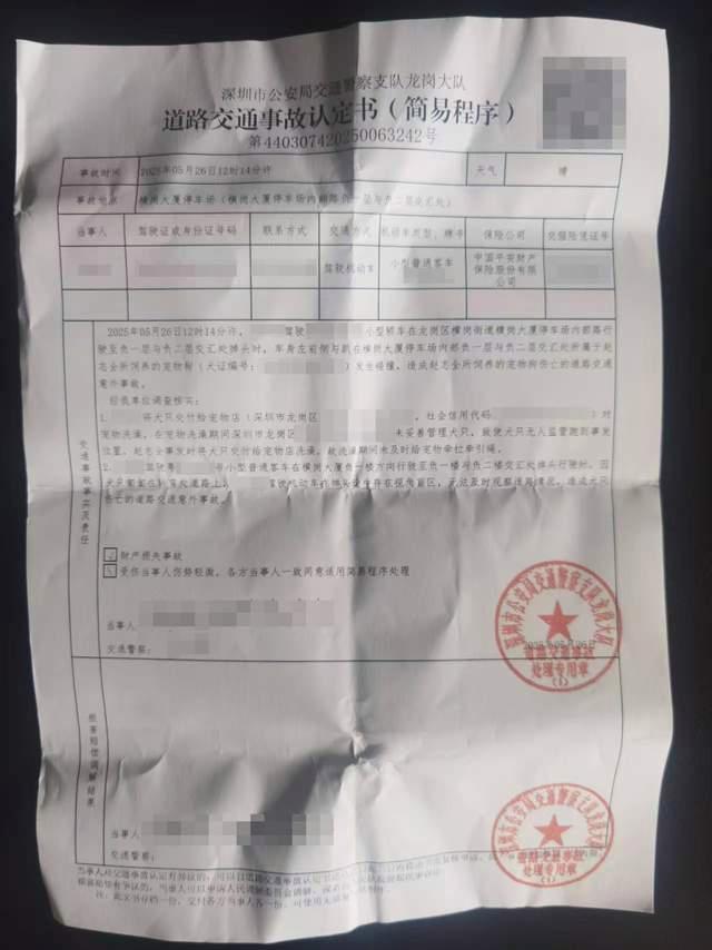 5月26日晚,交警找到了涉事车主,赵先生、宠物店与该车主在交警处进行三方调解,但未能达成一致。深圳市公安局交通警察支队龙岗大队开具的事故认定书显示,“火球”当时匍匐在转弯处道路上,处于车辆的视野盲区,无法被及时观测到。