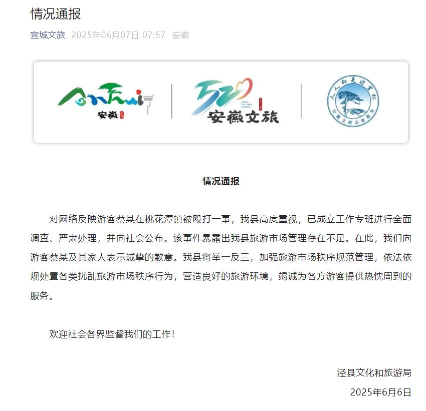 对网络反映游客蔡某在桃花潭镇被殴打一事,我县高度重视,已成立工作专班进行全面调查、严肃处理,并向社会公布。该事件暴露出我县旅游市场管理存在不足。在此,我们向游客蔡某及其家人表示诚挚的歉意。我县将举一反三,加强旅游市场秩序规范管理,依法依规处置各类扰乱旅游市场秩序行为,营造良好的旅游环境,竭诚为各方游客提供热忱周到的服务。