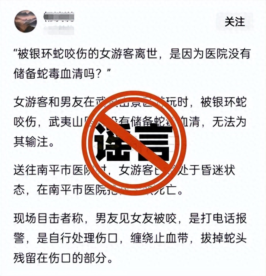 近日,一网民在某网络平台发布信息称“一女游客和男友在武夷山景区游玩时,被银环蛇咬伤,武夷山医院没有储备蛇毒血清,无法为其输注。送往南平市医院时,女游客已经处于昏迷状态,在南平市医院抢救无效死亡。”