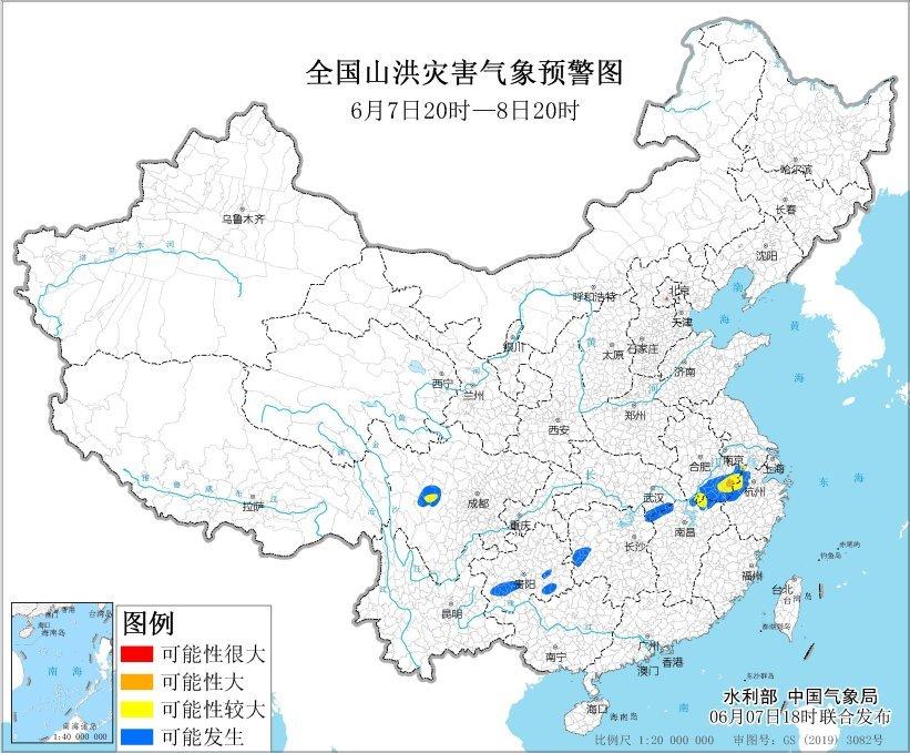 预计,6月7日20时至8日20时,浙江西部、安徽南部、江西东北部、四川中部等地部分地区发生山洪灾害可能性较大(黄色预警),其中,安徽东南部部分地区发生山洪灾害可能性大(橙色预警)。其他地区也可能因局地短历时强降水引发山洪灾害,请各地注意做好实时监测、防汛预警和转移避险等防范工作。