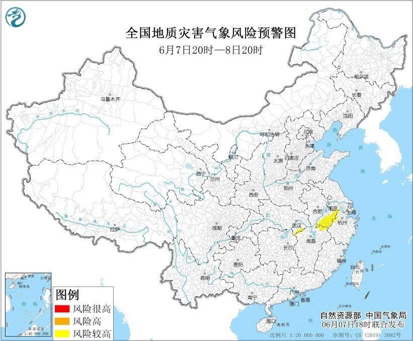 预计,6月7日20时至8日20时,江苏南部、浙江西北部、安徽南部、江西北部、湖北东南部、湖南东北部等地部分地区发生地质灾害的气象风险较高(黄色预警)。