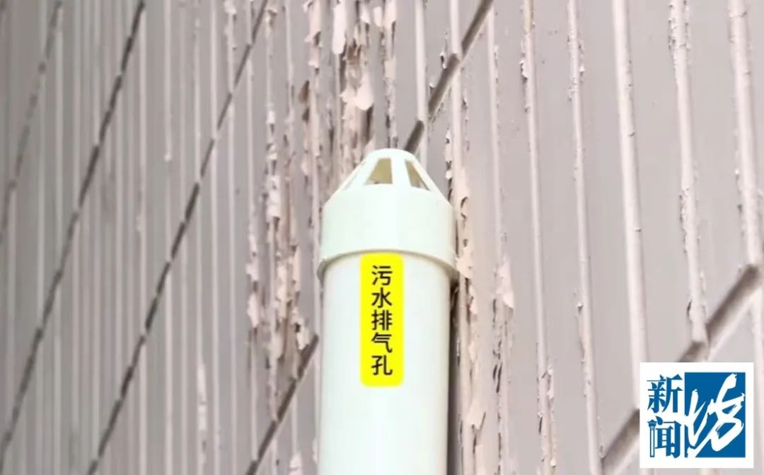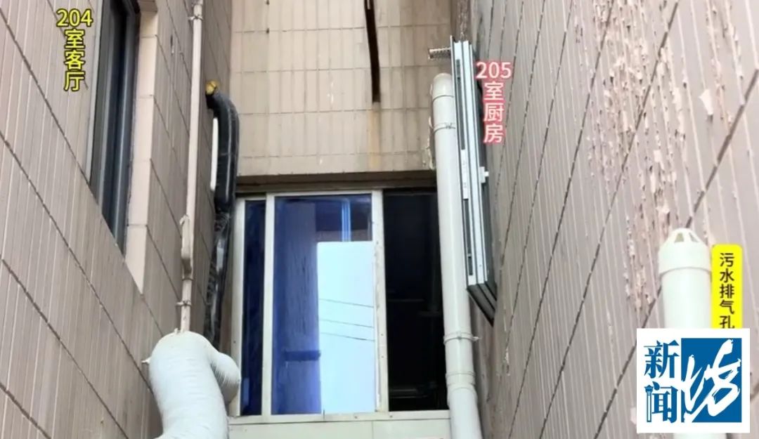 坊记注意到,改道后的排污管穿墙而出,顺着大楼天井接入小区排污池,问题是,这根排污管上还有散发着臭气的排气孔,就对着204室陈女士家的客厅和隔壁205室的厨房,直线距离不足3米。