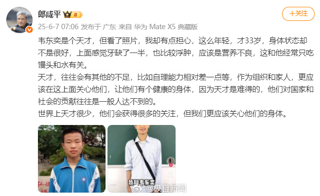 6月8日,经济学家郎咸平发文为韦东奕发声,他表示:韦东奕是个天才,但看了照片,我却有点担心,这么年轻,才33岁,身体状态却不是很好,上面感觉牙缺了一半,也比较浮肿,应该是营养不良,这和他经常只吃馒头和水有关。
