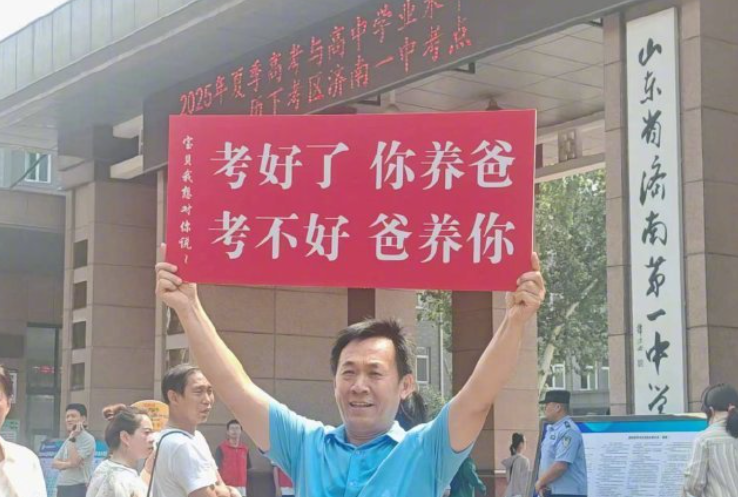 6月8日下午,在2025夏季高考济南一中考点外,一名父亲举着“考好了你养爸,考不好爸养你”的牌子送考,为考生提供满满了的情绪价值,也让许多送考家长纷纷喊好。