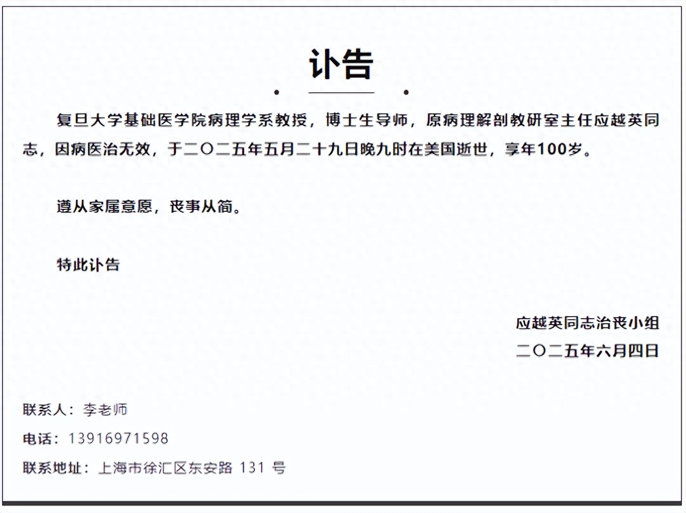 6月7日,复旦大学基础医学院发布讣告。复旦大学基础医学院病理学系教授,博士生导师,原病理解剖教研室主任应越英同志,因病医治无效,于2025年5月29日逝世,享年100岁。