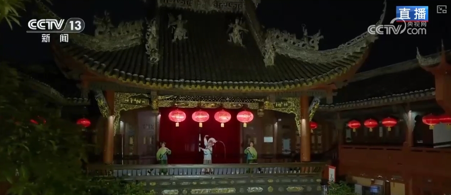而在古建筑内的戏台上,精彩的民俗表演正在上演。演出固定在每周六的晚上,有精彩绝伦的川剧变脸,也有婉转悠扬的四川清音。观众落座于红墙青瓦的院落中,在欣赏演出的同时品味一碗盖碗茶。茶艺师会来到观众身边,与观众近距离互动。茶艺师手中的铜壶很有特色,铜壶的壶嘴长约1米,每次在掺茶之前都会表演壶艺,观众在悠悠茶香中,沉浸于视听与嗅觉交织的传统艺术盛宴之中。