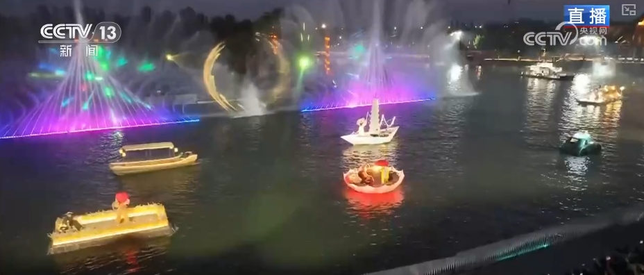 在渔田七里海的庆典花园,上演了一场沉浸式戏剧表演。这里有舞台没有座位,打破了传统表演的界限,观众既是旁观者,也是故事的参与者。故事聚焦的是普通的一家人,从孩子出生、成长到远行,再到回归的一个过程。当这温暖的一幕结束后,绚丽的烟花秀就开始了。当烟花在夜空中绽放,夜游的氛围也被推向高潮。从5月1日开园运营起,每天晚上这里都会进行5分钟左右的烟花表演,表演将持续到10月8日。2025年暑假期间,这里还将举办国际烟花艺术节,来自澳大利亚、俄罗斯、意大利等7个国家的顶尖烟花团队,将以“世界献给你的花”为主题,带来18场跨越时空与文化的视觉盛宴。