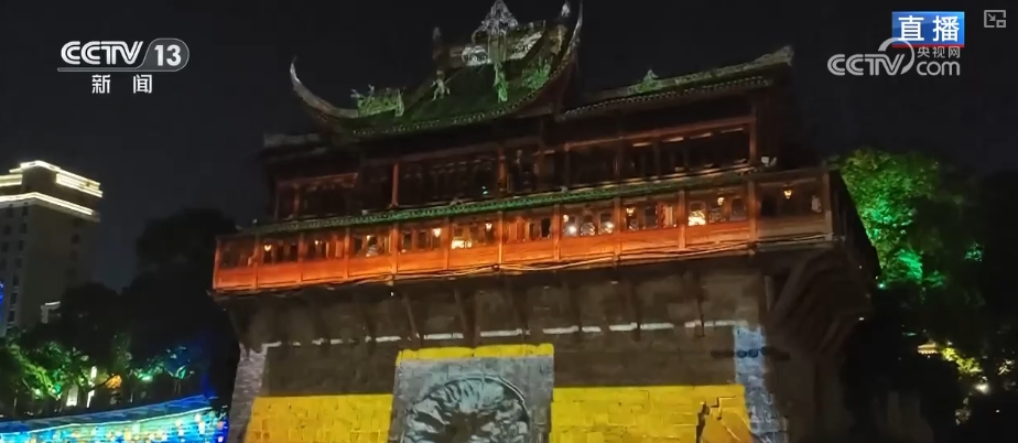 现在游船经过的这处景观是“夜游釜溪”的核心景观,画面中这座古建筑,是旧时盐运商集资修建的一座祠堂,叫“王爷庙”,又被称为“釜溪第一楼”,距今已经有百余年历史。游船行驶到这里将作片刻停留,因为在古建的外墙上正在上演裸眼3D光影秀,在这段3分钟左右的光影秀里,利用先进投影技术,将自贡独特的盐文化与民间传说深度融合,游客无需佩戴任何设备,就能沉浸式感受强烈的视觉冲击。每一个光影细节、每一次场景转换,都精准契合建筑轮廓与特色,再现当年釜溪河盐运的繁忙景象。