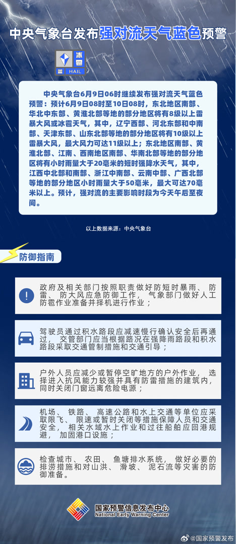 中央气象台6月9日06时继续发布强对流天气蓝色预警: