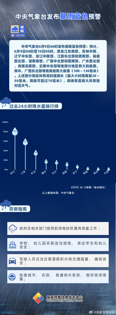 中央气象台6月9日06时发布暴雨蓝色预警: