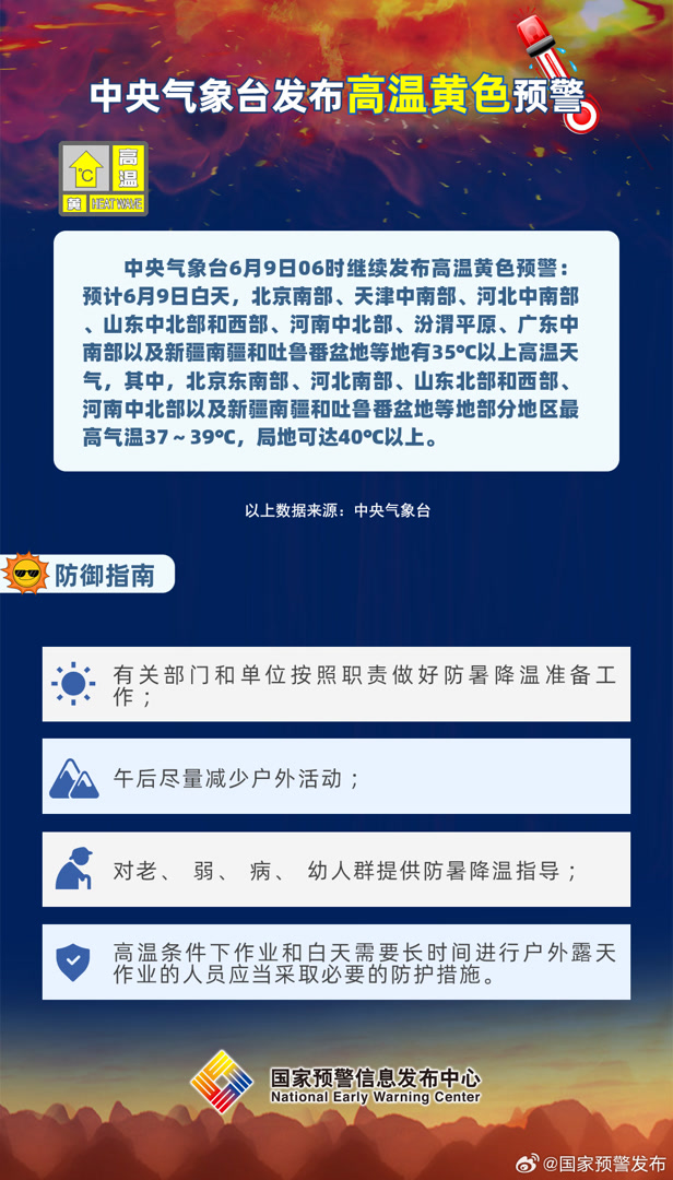 中央气象台6月9日06时继续发布高温黄色预警: