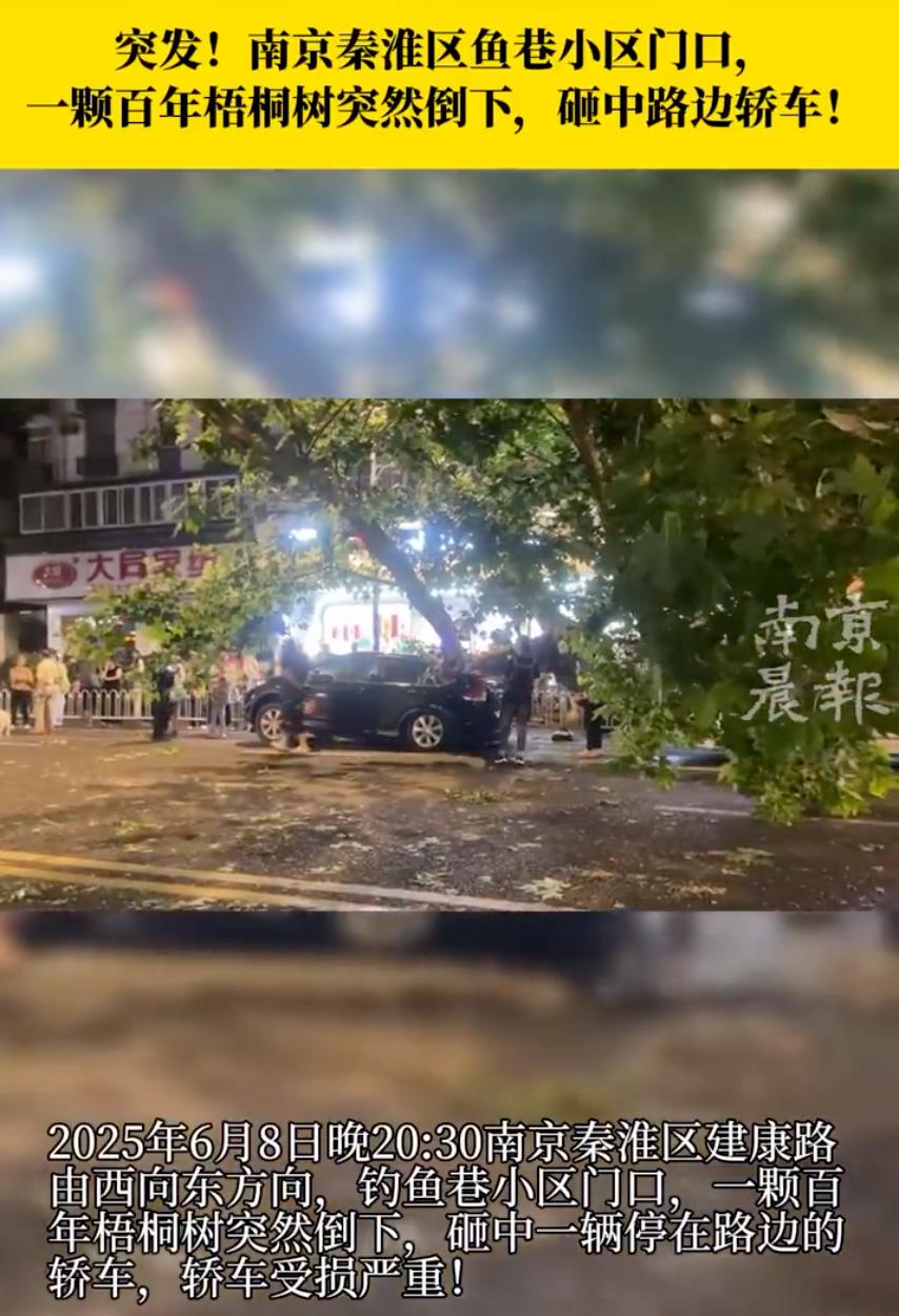 2025年6月8日晚20:30南京秦淮区建康路由西向东方向,钓鱼巷小区门口,一颗百年梧桐树突然倒下,砸中一辆停在路边的轿车,轿车受损严重。梧桐树干长20多米,路面被封堵,报警后交警迅速到场疏导交通,通知园林绿化前来处理,庆幸没有造成人员伤亡。