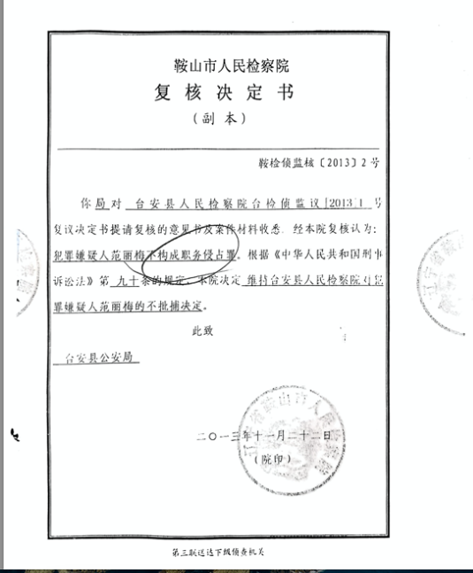 2012年11月28日,台安县检察院经审查认为,范丽梅涉嫌职务侵占罪事实不清、证据不足,决定不予批准逮捕。同日,范丽梅被取保候审。