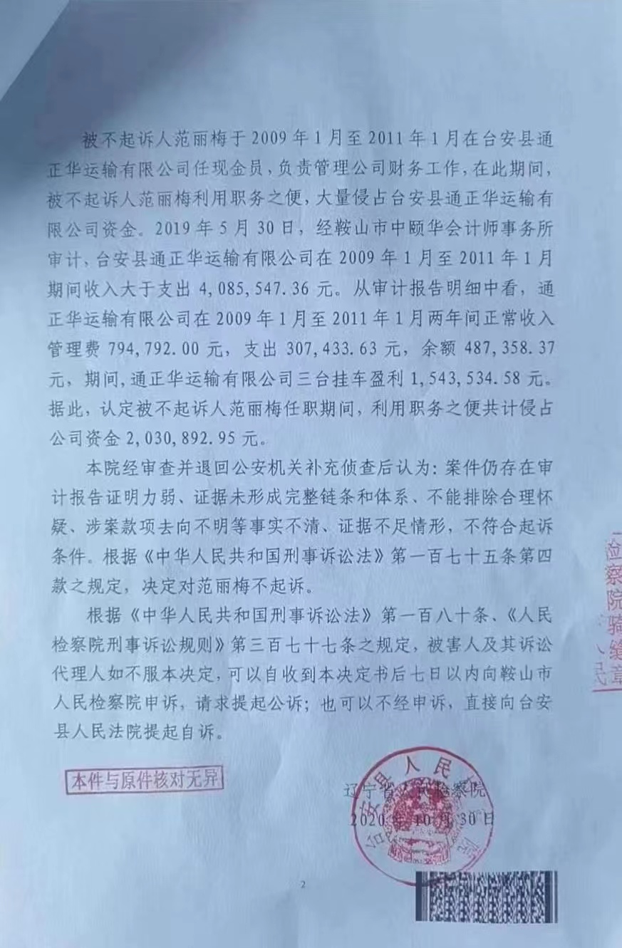 同年10月,台安县检察院经审查并退回公安机关补充侦查后认为,案件仍存在审计报告证明力弱、证据未形成完整链条和体系、不能排除合理怀疑、涉案款项去向不明等事实不清、证据不足情形,不符合起诉条件,决定对范丽梅不起诉。