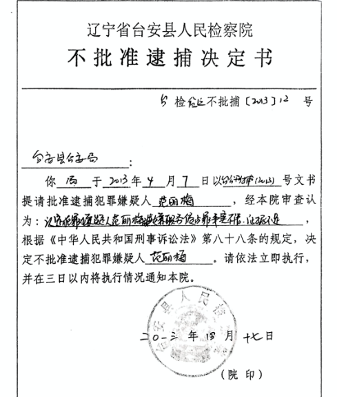 台安县公安局分别于2013年4月7日、6月20日、10月13日向台安县检察院提请批捕,台安县检察院分别于2013年4月17日、7月3日、10月28日决定不批准逮捕,理由均为范丽梅涉嫌职务侵占罪事实不清、证据不足。
