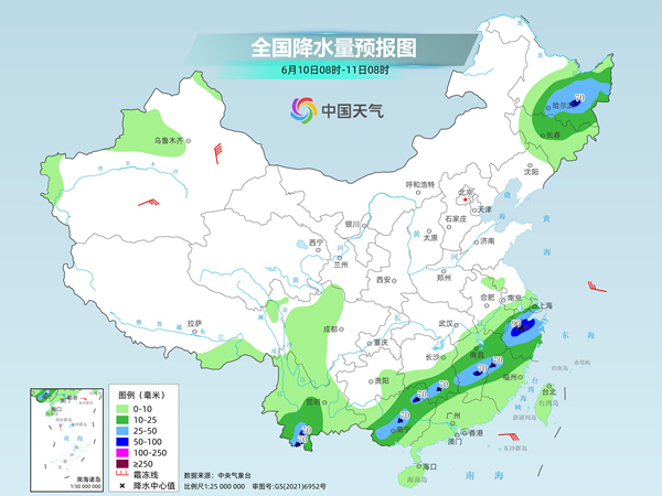 明天,东北地区东部、江南中东部和南部、云南西南部、华南北部和西部等地部分地区有中到大雨,其中,黑龙江东南部、江西中南部、浙江中北部、云南西南部、广西东北部等地部分地区有暴雨。