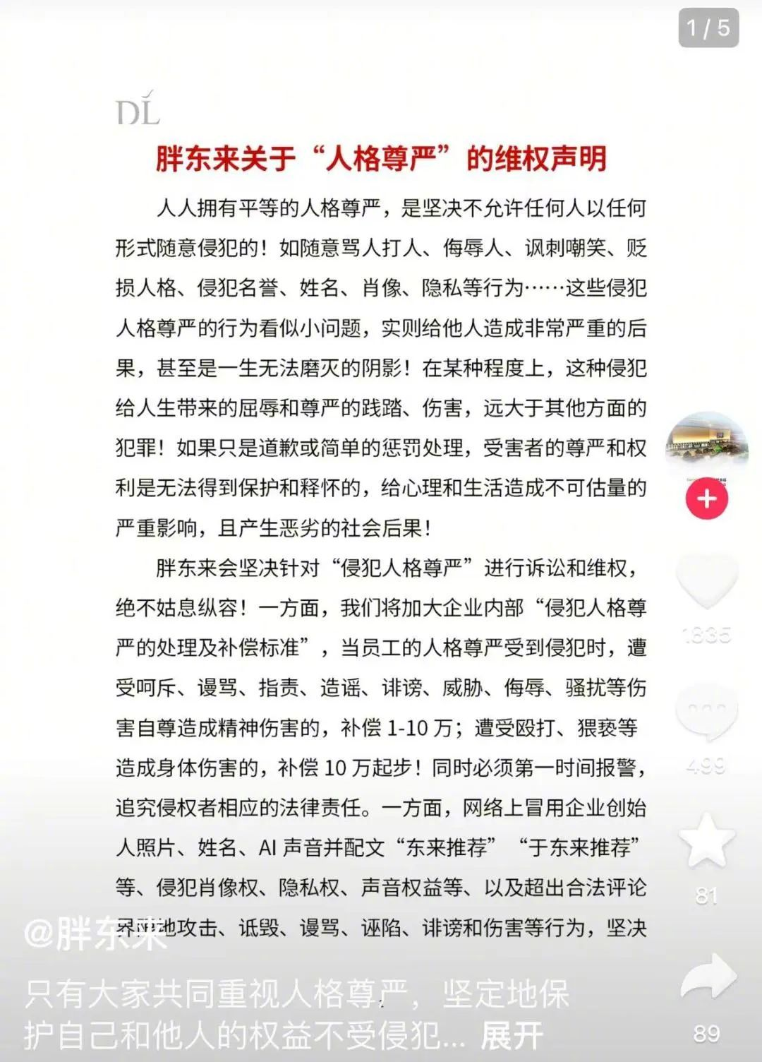当晚,胖东来还发布了关于“人格尊严”的维权声明。胖东来表示,将坚决针对“侵犯人格尊严”的行为进行诉讼和维权,绝不姑息纵容。