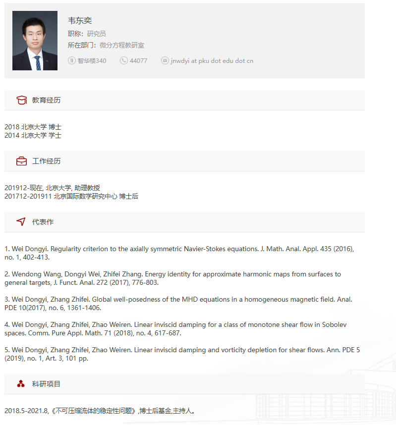 北京大学数学科学学院官网显示,韦东奕2017年12月至2019年11月为北京国际数学研究中心博士后,2019年至今任北京大学助理教授。其所在部门为微分方程教研室,职称为研究员。