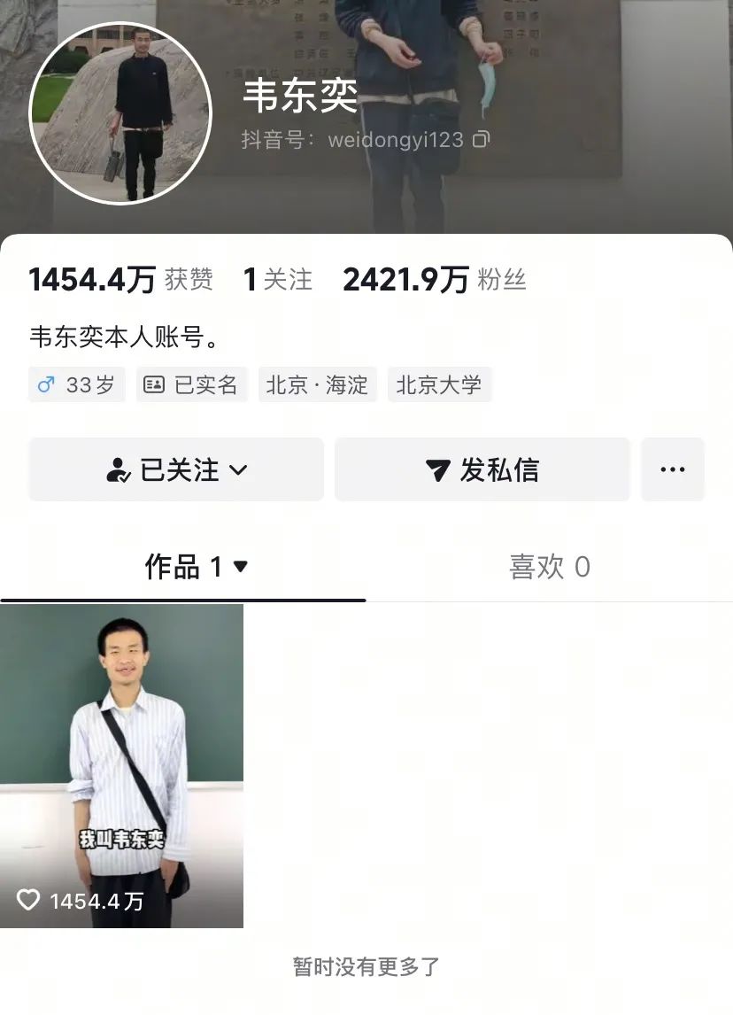 截至6月10日13时30分许,北京大学韦东奕个人社交账号粉丝量已突破2421万。此前,韦东奕因部分牙齿脱落,其健康情况引发网友关切。