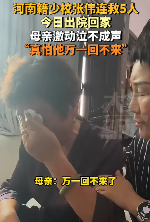6月10日,连救5人的河南籍军人张伟康复出院回家,母亲泣不成声:“真怕他万一回不来”。