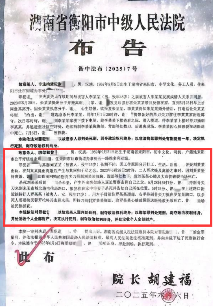 近日,一则湖南省衡阳市中级人民法院发布的布告引发关注,内容是“80后男子杀妻后劫持路人被执行死刑”。