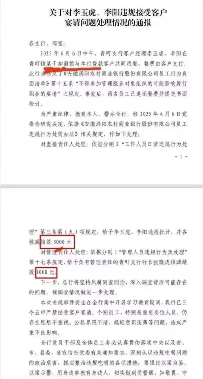 据这份名为《关于对李玉虎、李阳违规接受客户宴请问题处理情况的通报》的文件披露,事件发生于2025年6月6日中午。涡阳农村商业银行青町支行的客户经理李玉虎与李阳,在当地一家干扣面馆与该行的贷款客户一同用餐,餐费由客户方承担。
