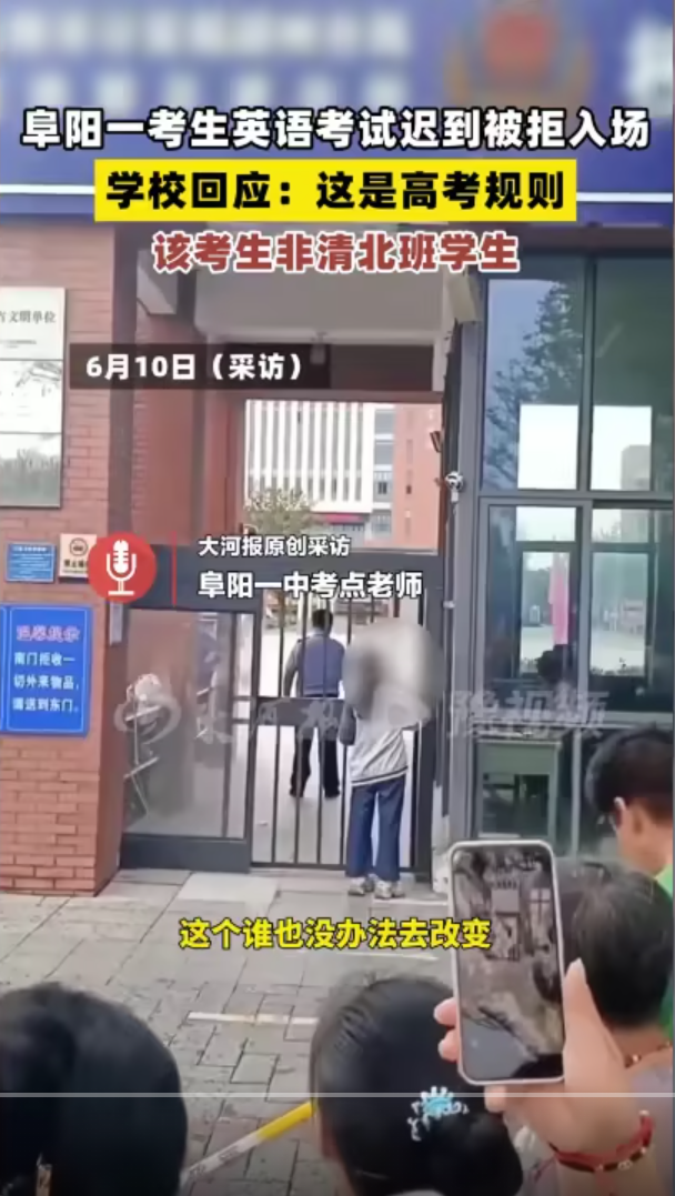 6月10日,大河报《看见》记者向阜阳一中核实,该校老师称迟到被拒入场是高考规则,这名学生并非清北班考生。