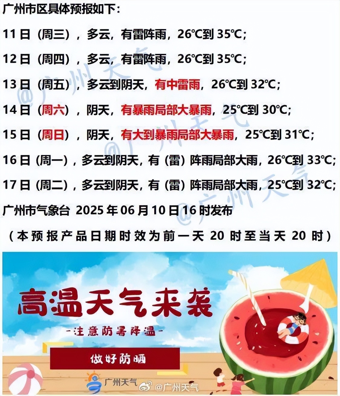广州未来几天天气炎热,雷雨刷屏;周末可能受热带系统影响,有明显风雨,气温稍降。出门随身带伞,行车避开积水路段,雷雨时远离户外广告牌等易倒塌物!