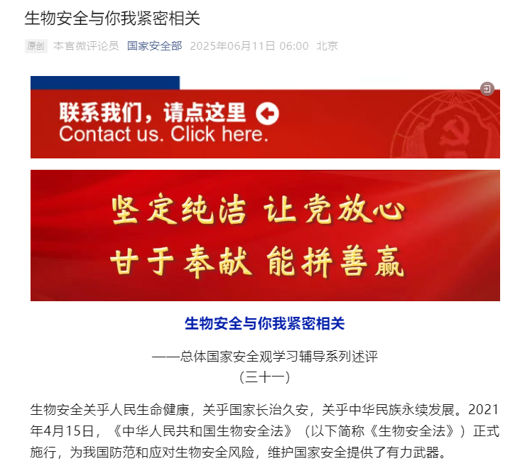 据国家安全部,近年来,国家安全机关先后破获一批破坏我国家生物安全的重要案件,为维护国家生物安全作出了贡献。