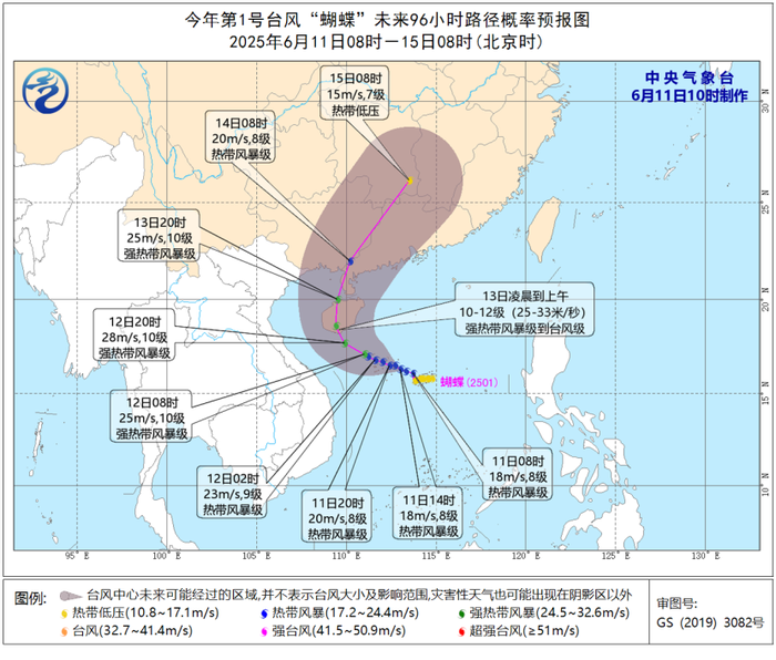 大风预报:6月11日14时至12日14时,南海大部、北部湾、琼州海峡、西沙群岛、南沙群岛、中沙群岛、广东沿海、海南岛沿海将有6-8级风,阵风9-10级,台风中心经过的附近海域风力可达9-10级,阵风11-12级。