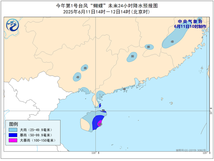 降水预报:6月11日14时至12日14时,广东中西部沿海、广西沿海、海南岛大部、西沙群岛等地有大雨,其中,海南岛中东部的部分地区有暴雨或大暴雨(100-150毫米)。