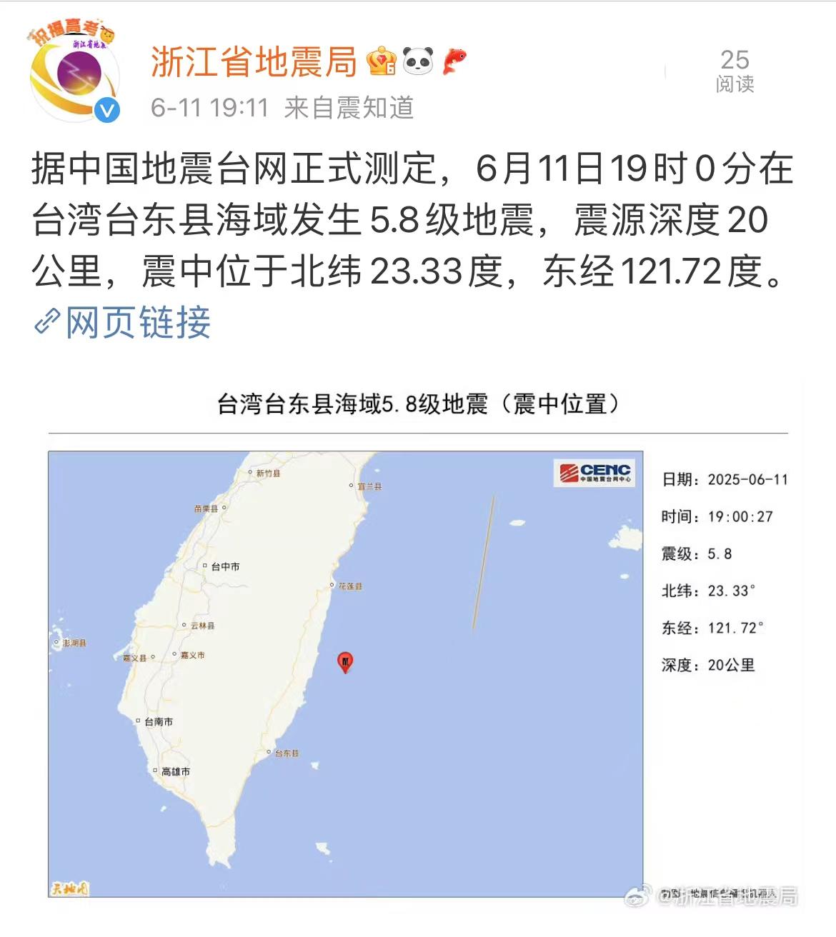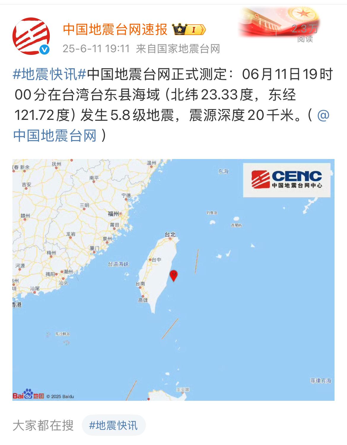 中国地震台网正式测定:06月11日19时00分在台湾台东县海域(北纬23.33度,东经121.72度)发生 5.8级地震,震源深度20千米。