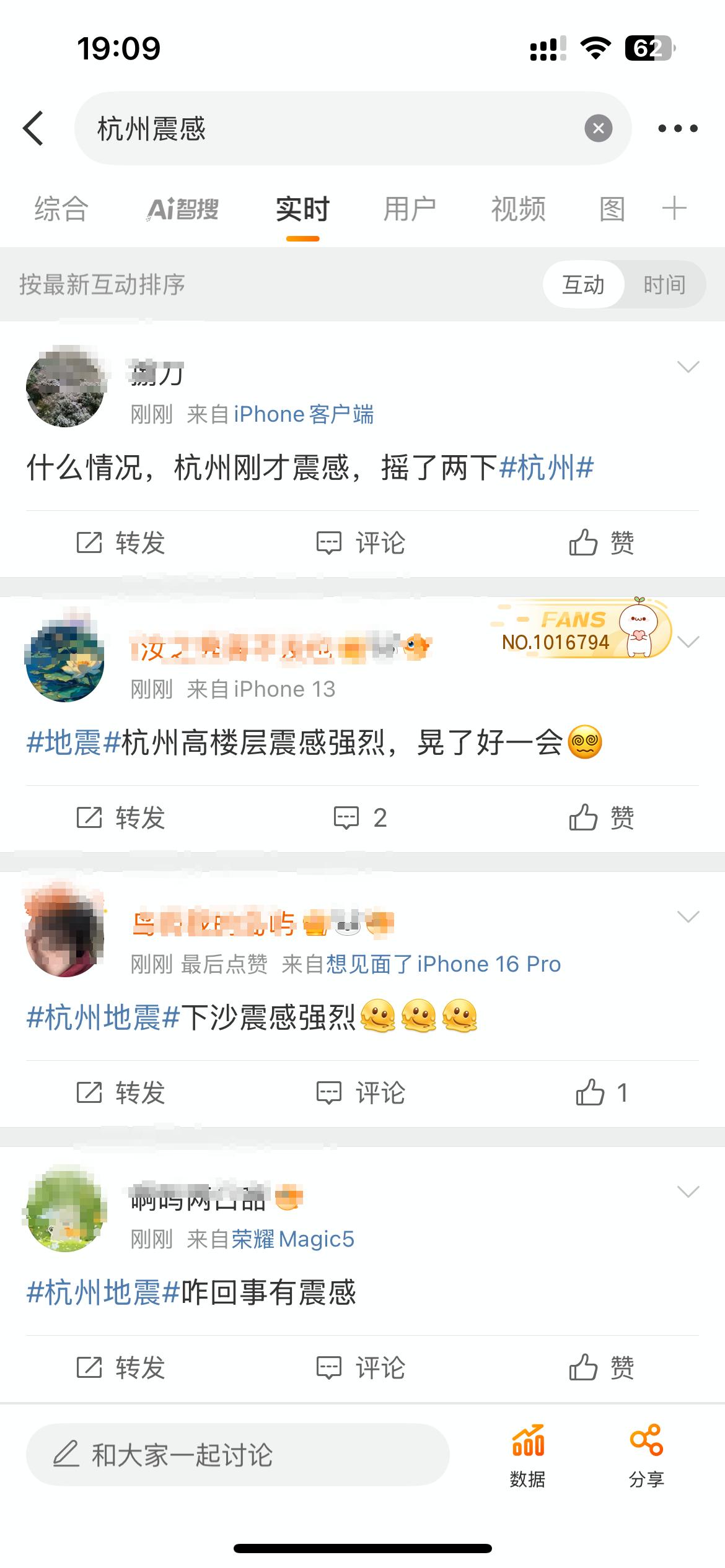 徐先生打开手机,就看到微博上中国地震台网速报的弹窗。“之前台湾地震,我也感受到了,就把速报微博设置成弹窗了。”他说,打开微博一看,有不少杭州网友都有同样的感受,“希望地震发生地的人能够平安”。