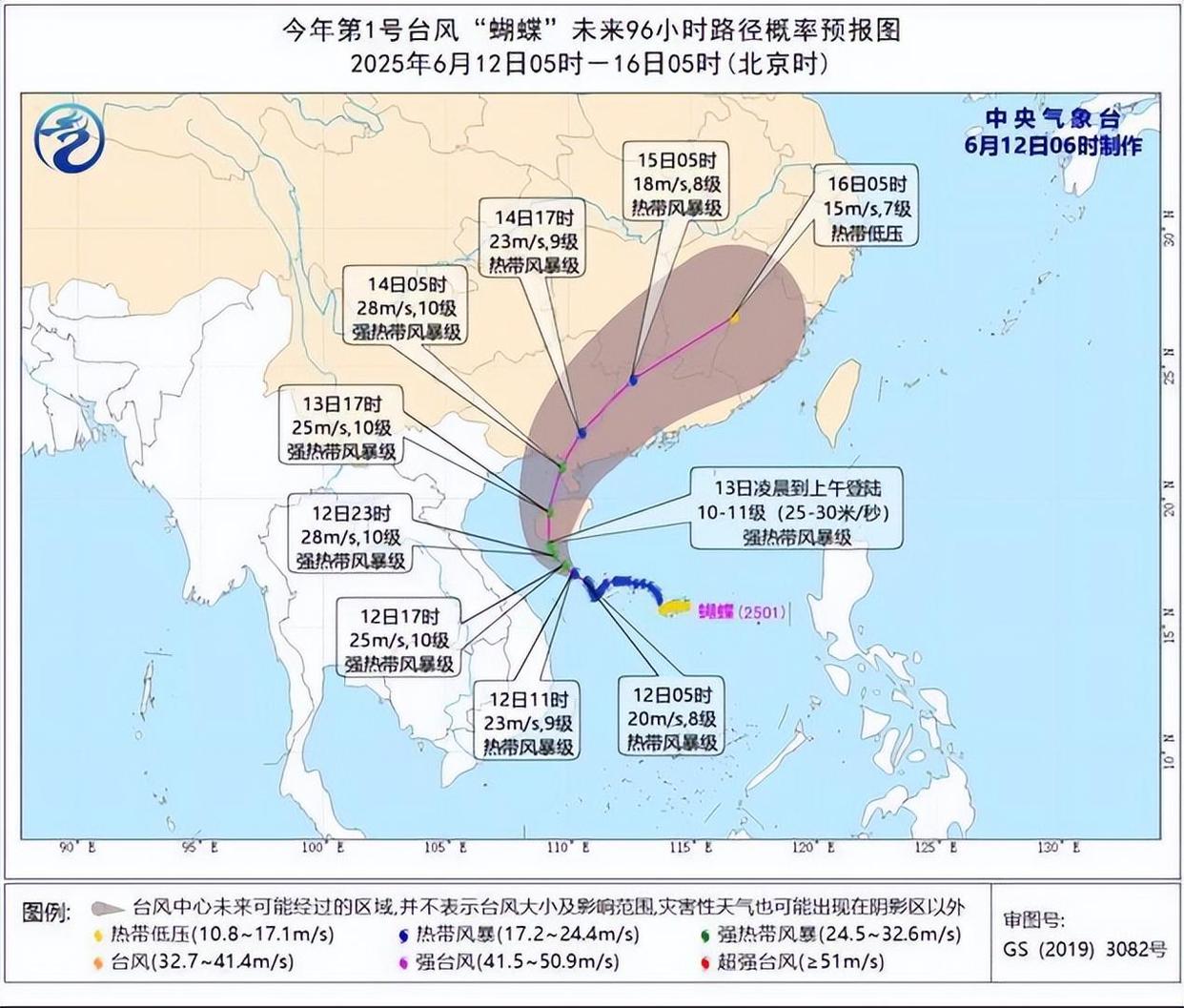 今年第1号台风“蝴蝶”(热带风暴级)的中心今天(12日)早晨5点位于海南三亚东偏南方向大约205公里的海面上,就是北纬16.8度、东经110.7度,中心附近最大风力8级(20米/秒),中心最低气压为990百帕,七级风圈半径100-260公里。