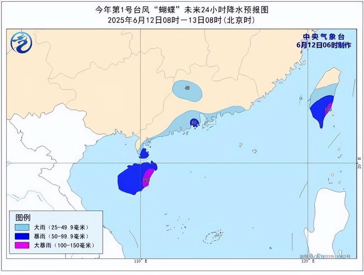 降水预报:6月12日08时至13日08时,广东北部和中西部沿海、海南岛大部、台湾岛有大雨或暴雨,其中,海南岛东南部和台湾岛东南部的部分地区有大暴雨(100-150毫米)。