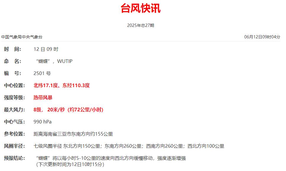 今天(12日)9时,台风“蝴蝶”中心距离海南省三亚市东南方向约155公里,也就是北纬17.1度、东经110.3度,中心附近最大风力8级(20米/秒),中心最低气压990百帕。