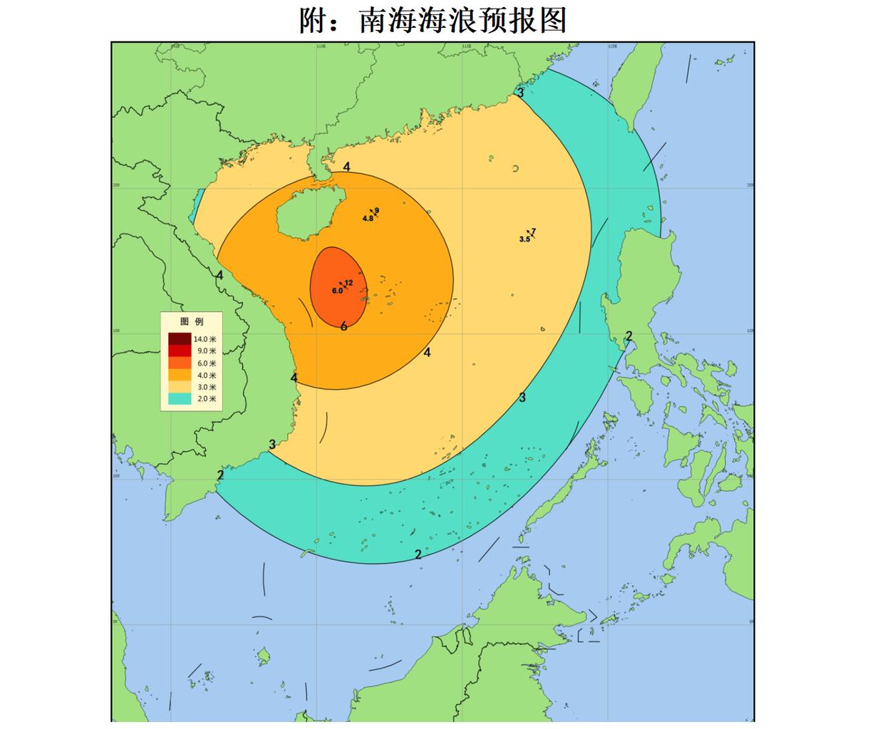海南岛以南、西沙附近海面有4.0~6.0米的巨到狂浪。雷州半岛以东、北部湾南部、海南岛以东、南沙北部海面有4.0~5.0米的巨浪。北部湾北部、琼州海峡海面有3.0~4.0米的大到巨浪。东沙附近、中沙附近、南沙以南到曾母暗沙附近海面有2.5~3.5米的大浪。近海海域海浪预警级别为黄色。