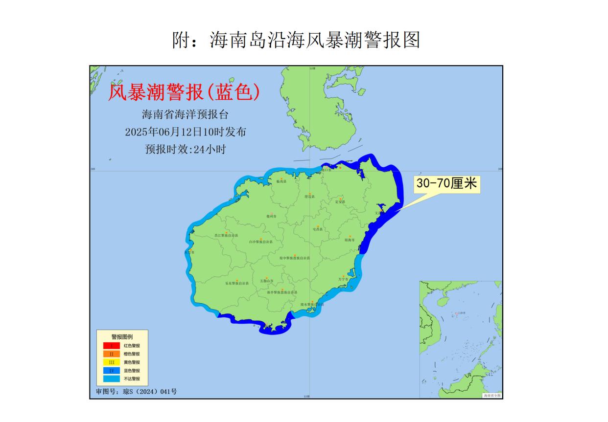 此外,海南省海洋预报台6月12日10时发布风暴潮蓝色预警:受今年第1号台风“蝴蝶”(热带风暴级)影响,预计6月12日上午至13日上午,海南岛沿海将出现30到70厘米的风暴增水,海口市、文昌市、琼海市和三亚市的风暴潮预警级别为蓝色。