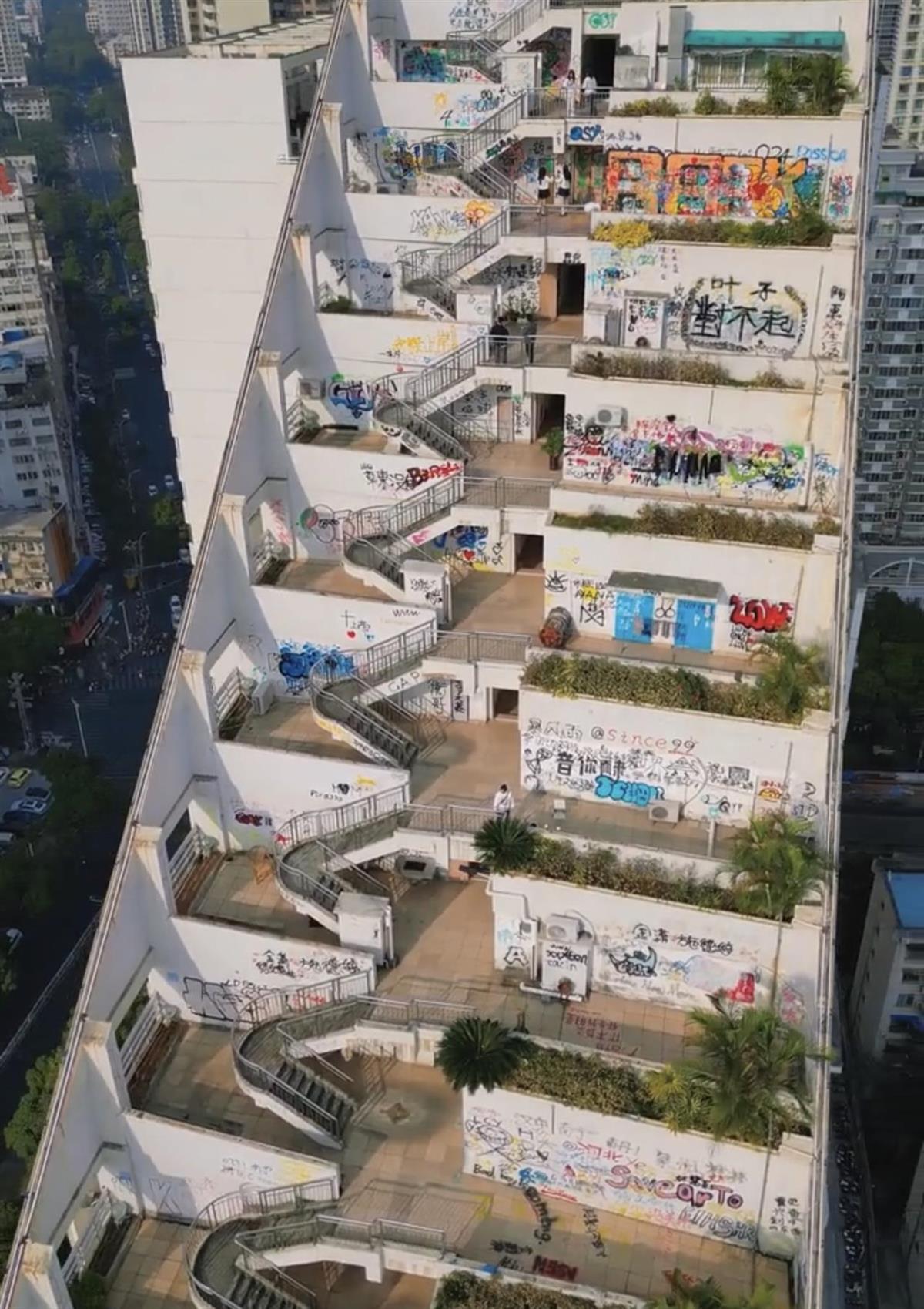 从他拍的航拍视频里可以看到,大楼一侧有一片露天的阶梯式空间,每一层的布局都相同,有楼梯和露台,而露台的墙体上都有各式各样的涂鸦。