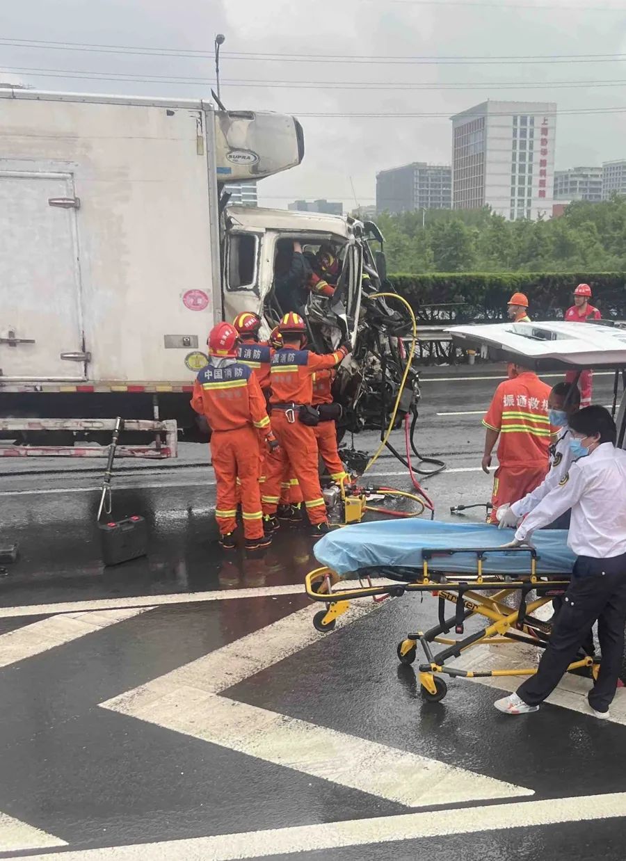 接到报警,交警,消防和医疗部门人员相继到场处置。消防队员到场后,使用消防器具对货车变形的车头实施破拆,消防抢险人员随后进入驾驶室内对车内空间进行扩张,最终成功将副驾驶座上的被卡人员救出。